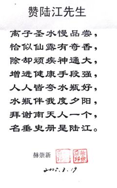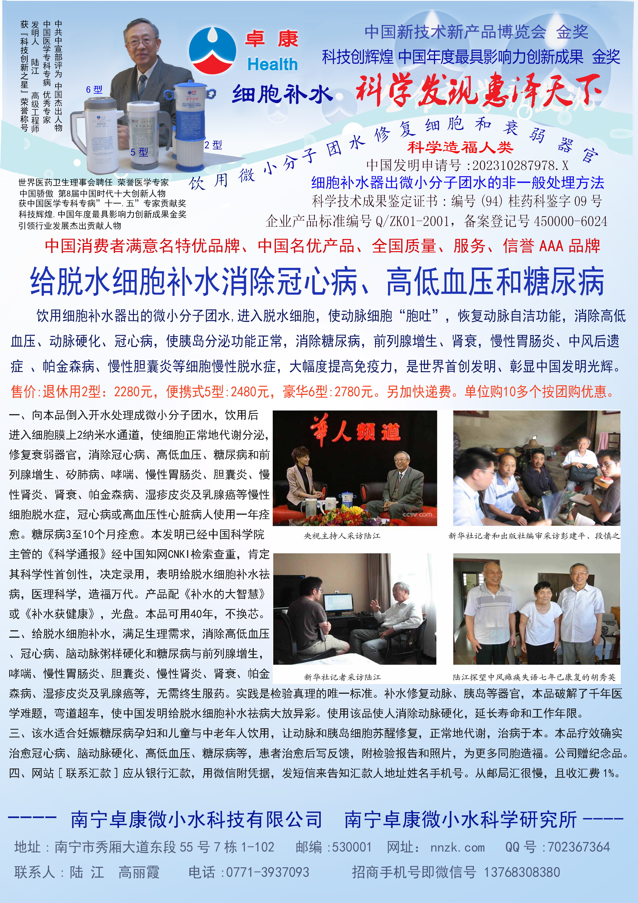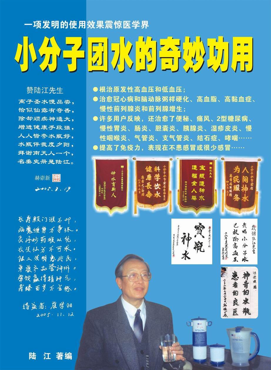 -----我是從事建筑的高工,本來沒有資格去攻克醫學難題,卻為了自身健康才扣響醫學的大門。由于我1990年患高血壓,因怕中風才研究發明了離子水瓶,我把水處理成微小分子團水,飲用后治愈了高血壓。便于1993年底送到三家省級醫院做臨床試用4個月。經北京和廣西醫學專家鑒定:"降脂降壓效果好"," 能擴大心腦動脈流量,改善心腦電圖以及微循環","對治療心腦動脈粥樣硬化、高血壓、高血脂有良好的醫療保健作用。""產品的技術性能和療效達到了同類產品的國內領先水平,經廣西醫學科學情報研究所檢索,未見國外有類似報道。"中國醫學科學院張正國教授從美國國立醫學圖書館數據庫存Medline檢索英俄文資料,均未見類似報告。2000年上市后,我為了對消費者負責而繼續觀察研究,一直通過《信譽卡》和《質量跟蹤調查書》向患者承諾療效,請用戶使用6個月后反饋效果。和脂壓患者飲用2至5個月內,消除癥狀,停服藥物,血壓正常;冠心病患者飲用3~5個月逐漸減輕至消除心絞痛、房顫等癥狀,不再服藥,飲用1年左右心電圖正常,經冠脈造影掃描無明顯狹窄,表明冠心病痊愈。大量患者還反映許多衰弱器官被修復,讓前列腺增生、慢性咽喉炎、慢性氣管炎、支氣管炎、慢性胃炎、腸炎和膽囊炎等不藥而愈;2型糖尿病患者是因為胰島衰弱致病,飲用該水半年至一年,逐漸減藥至停藥,血糖尿糖正常,真正治愈2型糖尿病。中風后遺癥患者飲用六七個月,可逐漸減輕至消除肢體和語言障礙,表明飲用該水能讓壽命很長的神經元細胞逐漸修復,奇跡般地恢復肢體和語言功能。飲用后還使胸腺和脾臟兩個重要的免疫器官被修復和增強,產生免疫細胞多,提高了免疫力,使人不生病或少生病。自此, 飲用微小分子團水創造了攻克冠心病、高(低)血壓和糖尿病三大醫學難題的奇跡。人們對此感到不可思議,但實踐是檢驗真理的唯一標準。