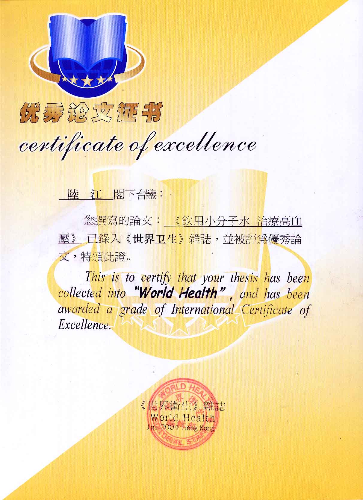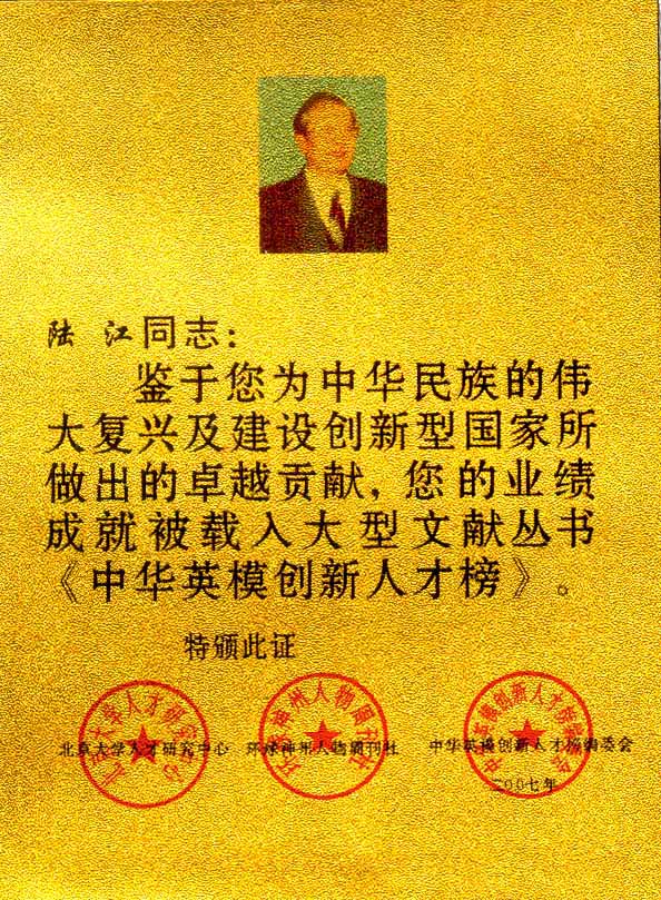 陸江的論文獲一等獎榮譽證書-- 陸江論文獲創新論文獎牌