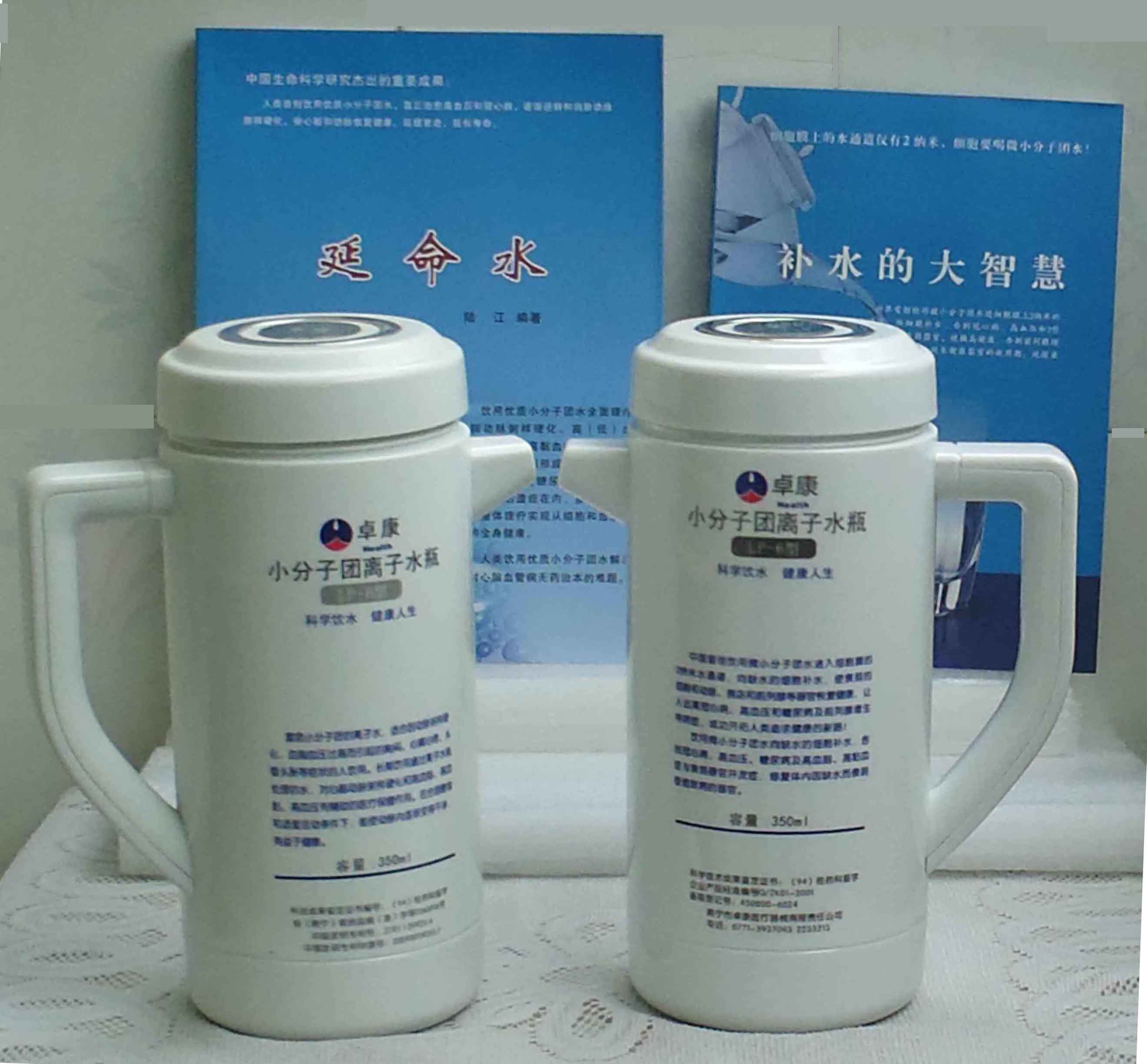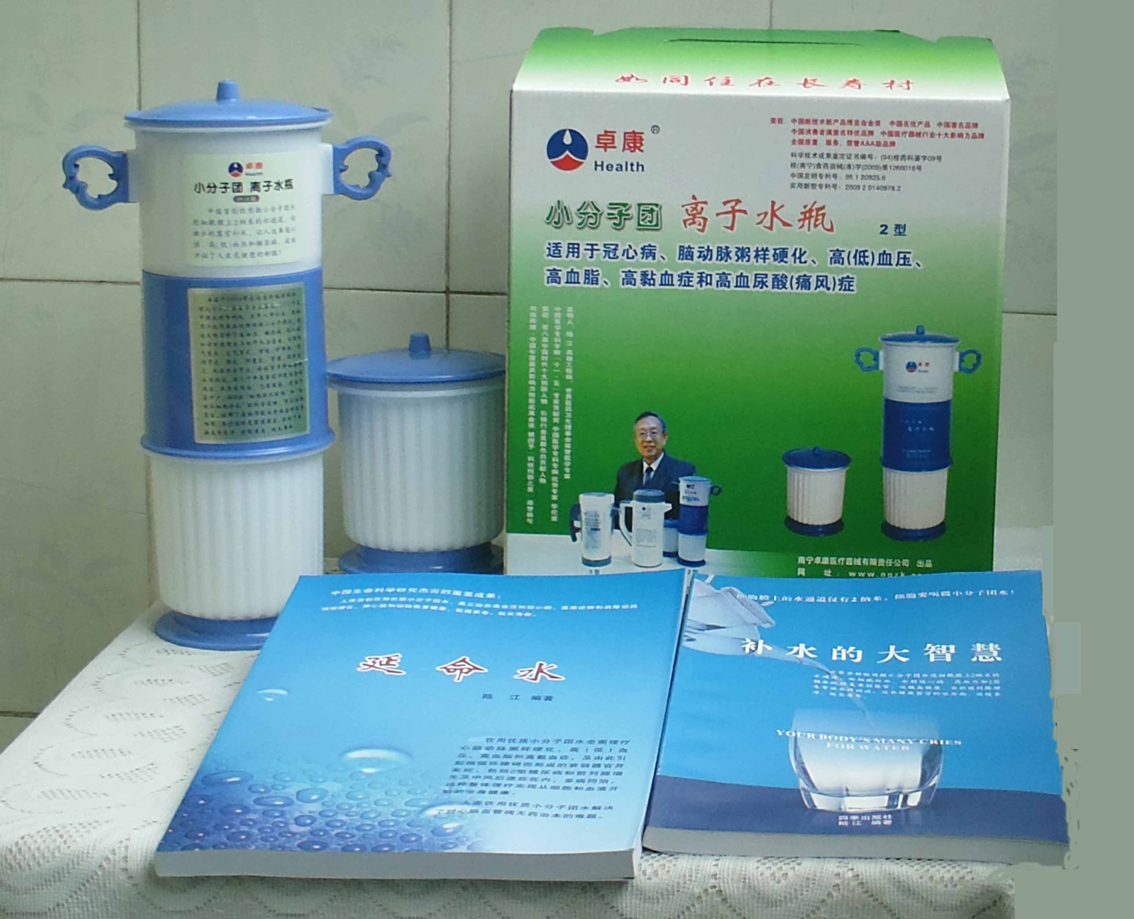 本品大量用戶的使用效果表明,能治愈冠心病、腦動脈硬化、原發性高(低)血壓、高血脂、高粘血癥、高血尿酸癥(痛風)和2型糖尿病、衰弱器官并發癥(前列腺增生、腎衰與尿毒癥)及中風后遺癥等療效好。產品配信譽卡。使用壽命30年,不換芯,易清洗。團購優惠。從郵局匯款,匯費1%,地址按本頁下方地址、聯系人寫。從銀行匯款,請點擊[聯系匯款]欄,從工商銀行匯款,建設銀行、農業銀行匯款,均免收匯費,匯款后20--30分鐘內發短信,可用微信轉帳,均免匯費,微信號即手機號13768308380。匯款后,告知你的姓名和地址,我公司聯系人手機號是:13768308380。卓康牌離子水瓶為我公司獨家生產,郵購產品配《補水的大智慧》彩印書一本,另配四季出版社出版的新書《補水的大智慧》一本,并配光盤一張(含央視主持人釆訪陸江的對話視頻)。目前市場和"淘寶網"上有人兜售假冒的偽品,望讀者審察辯別真偽,造假者剽竊假冒本公司的各種認證、獲獎獎項、專利號和外包裝盒上的中英文字,包括科技成果的鑒定意見等,請讀者注意防偽。如何識別假貨?已經買了假貨怎么辦?(請點擊[打假掠影][打假掠影])。