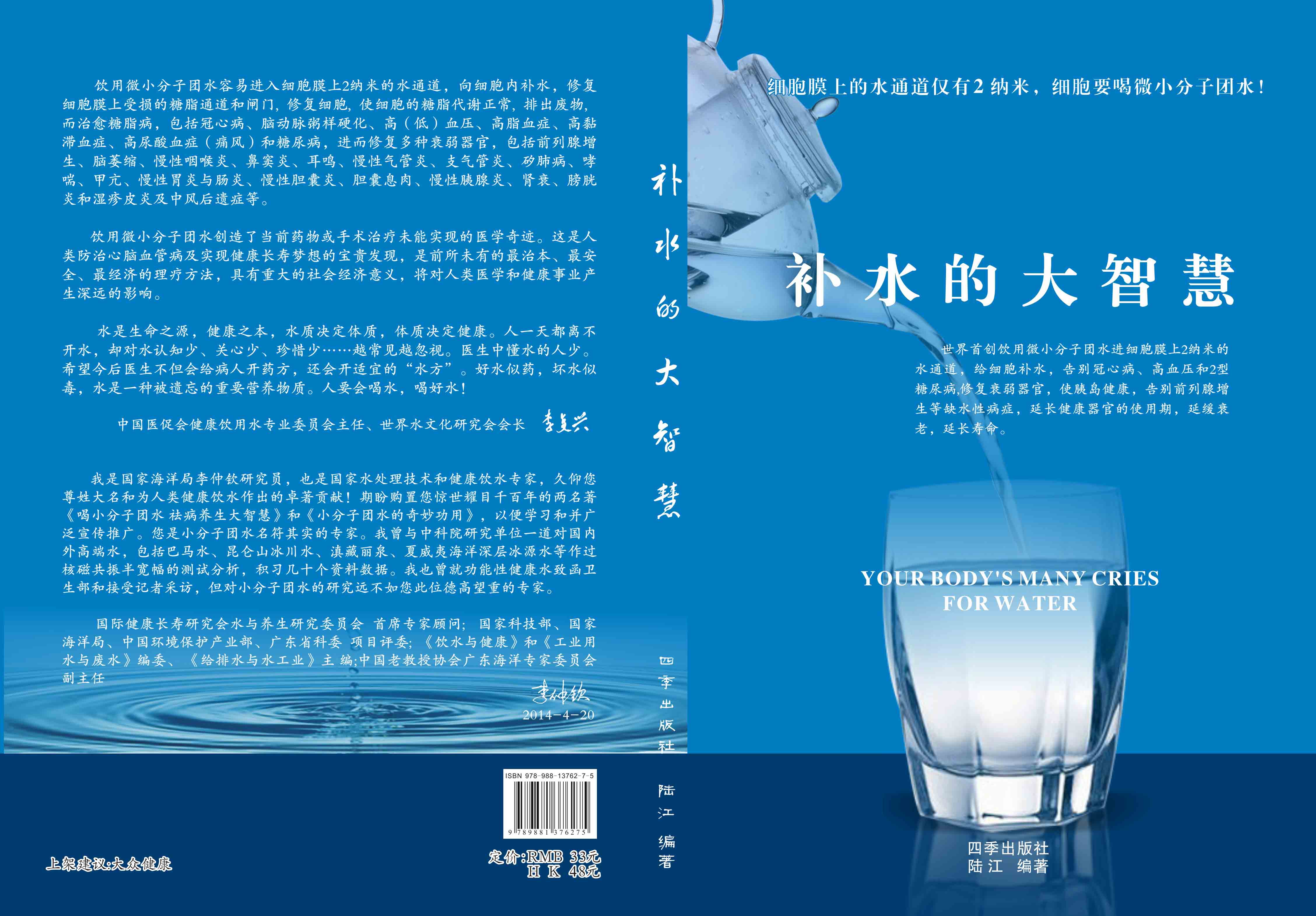 ----幾千年來,人們感到口渴才喝水,誤認為口渴是唯一的缺水信號,使喝水量偏少。很多人只知道補血補氣補腎補鈣補硒,而不知補水,逐漸使許多器官缺水,包括皮膚、動脈、氣管、膽囊、腸胃、骨關節、腎臟、前列腺和胰島缺水,以致患冠心病、高(低)血壓和糖尿病等缺水性病癥。美國F·巴特曼醫學博士寫有《水是最好的藥》一書很受歡迎,我國2007年譯成中文版,論述人體缺水引起許多病癥,他指導3000多患者喝水治愈了哮喘、胃炎和高血壓等病癥。而我是從2000年起,讓患者飲用微小分子團水,因為容易進細胞膜上2納米的水通道,治愈了許多缺水性的病。我跟蹤調查14年,發現凡是認真飲用和合理膳食,可治愈冠心病、高(低)血壓和2型糖尿病與衰弱器官并發癥及中風后遺癥。高血壓患者飲用2~5個月,癥狀消除,不再服藥,逐漸逆轉至消除動脈粥樣硬化,血壓正常穩定,治愈了高血壓;冠心病人飲用3~5個月,消除心絞痛、房顫等癥狀,不再服藥,一年左右心電圖正常,經冠狀動脈造影掃描表明冠脈內無粥樣斑塊,真正治愈了冠心病;2型糖尿病人飲用3~10個月停藥,血糖尿糖正常,糖尿病痊愈。并且使前列腺增生、慢性咽喉炎、鼻竇炎、耳鳴、慢性氣管炎、支氣管炎、哮喘、矽肺病、慢性胃腸炎、膽囊炎、胰腺炎、腎衰、膀胱炎、風濕性關節炎、便秘、痔瘡和濕疹皮炎等不藥而愈,而無需終生服藥。飲用微小分子團水治愈的是長期吃藥治不好的病,彌補了幾千年來醫藥的欠缺,成為人類健康的寶貴資源。